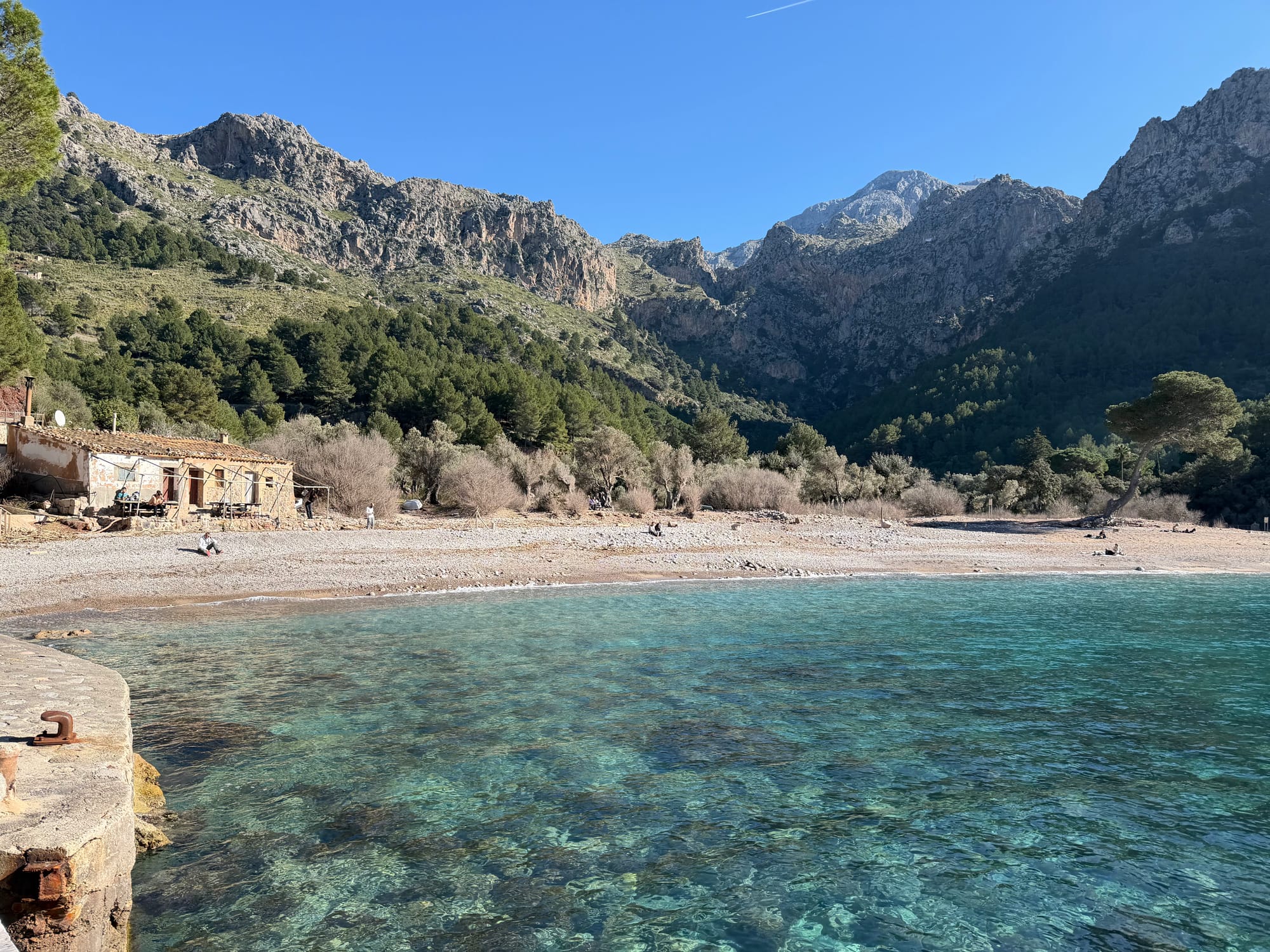 Mein zweites Ziel war die abgelegene Bucht Cala Tuent. Die Parkplätze sind hier rar gesät, doch zu dieser Jahreszeit hat man meist Glück. Am ruhigen Kieselstrand waren nur wenige Menschen unterwegs – perfekte Bedingungen, um kurz durchzuatmen. Ich habe mich auf die Suche nach einem Multicache gemacht, allerdings ohne Erfolg. Manchmal gehört auch Scheitern dazu … der Cache wurde das letzte Mal in 2025 gefunden und den Baum vor einer bestimmten Felsformation habe ich nicht gefunden.