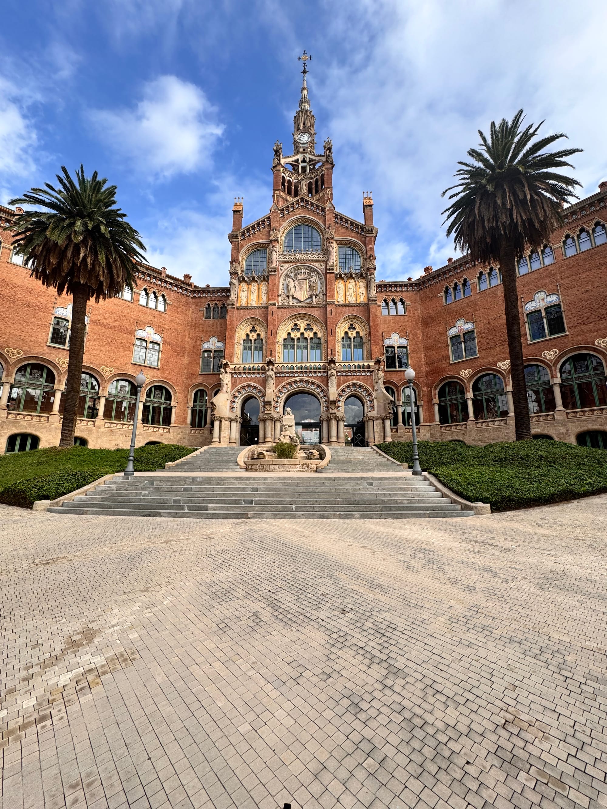 Danach ging es zu Fuß zum Hospital de Sant Pau. Es ist ein Jugendstil-Meisterwerk von Lluís Domènech i Montaner. Die bunten Pavillons mit Mosaiken und Skulpturen dienten einst als Krankenhaus und sind heute UNESCO-Weltkulturerbe sowie Kulturzentrum. Für eine Innenbesichtigung fehlte heute die Zeit.