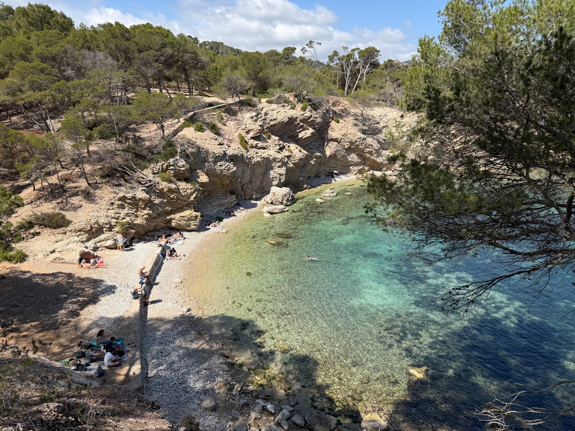 Die Caló d'en Monjo ist eine U-förmige Bucht, umgeben von Kiefernwäldern und Klippen mittlerer Höhe. Kein Sandstrand – Steine, Felsen, klares Wasser.