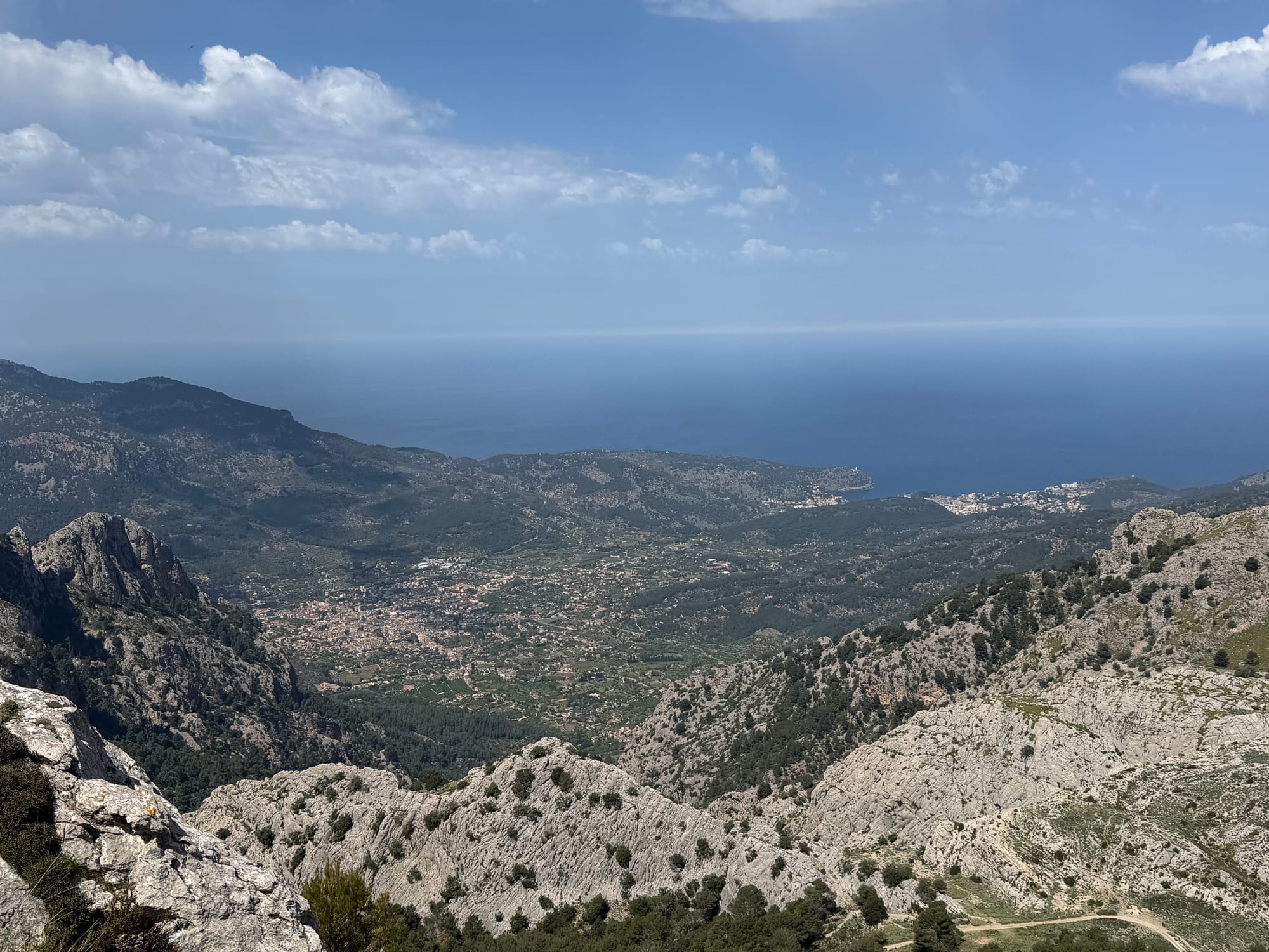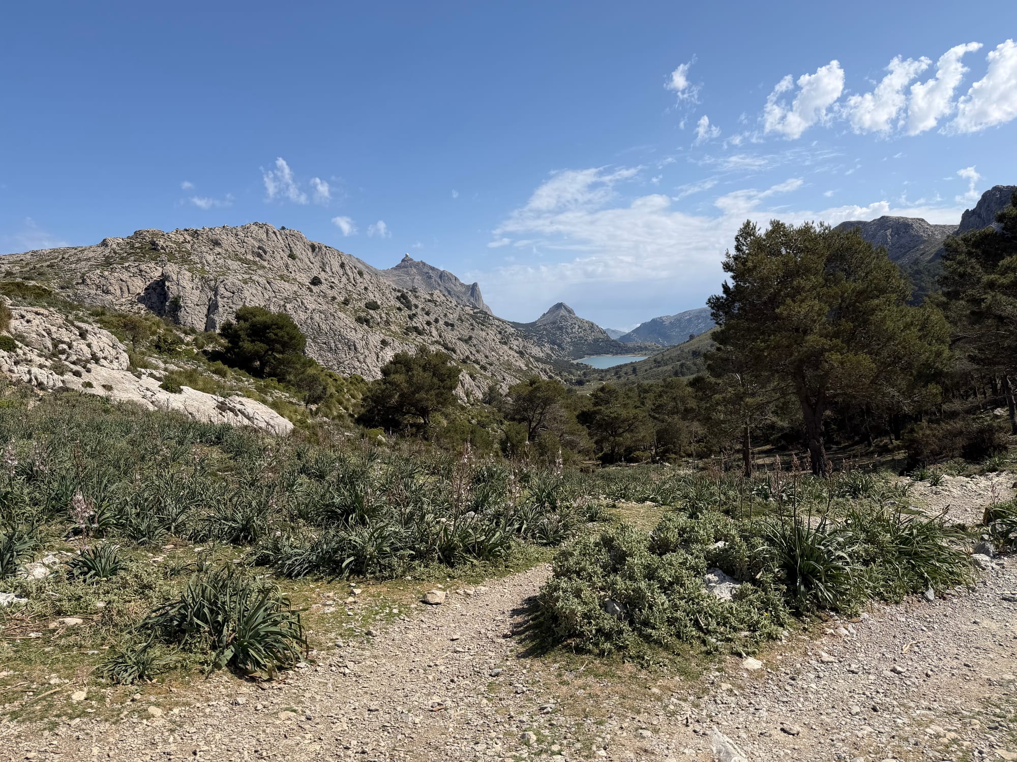 Am Anfang der Strecke geht es am Fernwanderweg GR-221 entlang. Hier waren auch einige andere Wanderer unterwegs. Der erste Teil der Strecke führt am Cuber-Stausee entlang. Danach geht es zum Coll de l’Ofre (875 Meter). Ein Kreuz befindet sich am Pass und es gibt von hier eine schöne Aussicht zum Stausee.