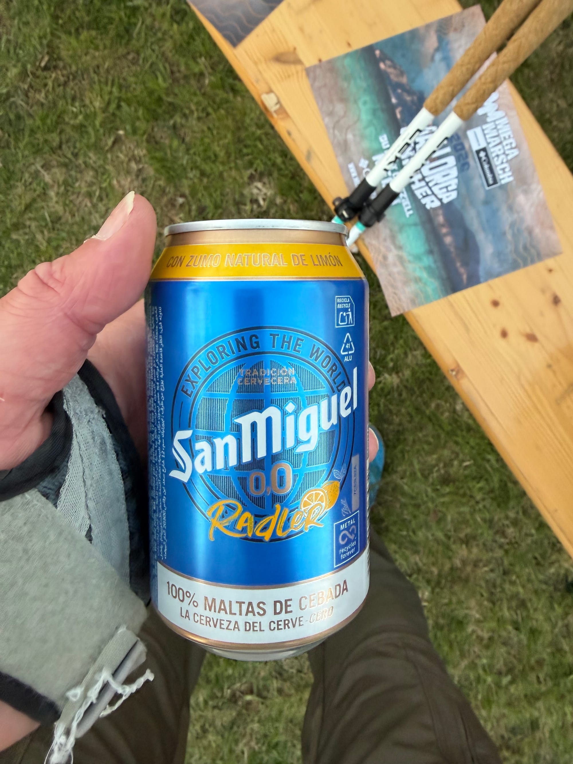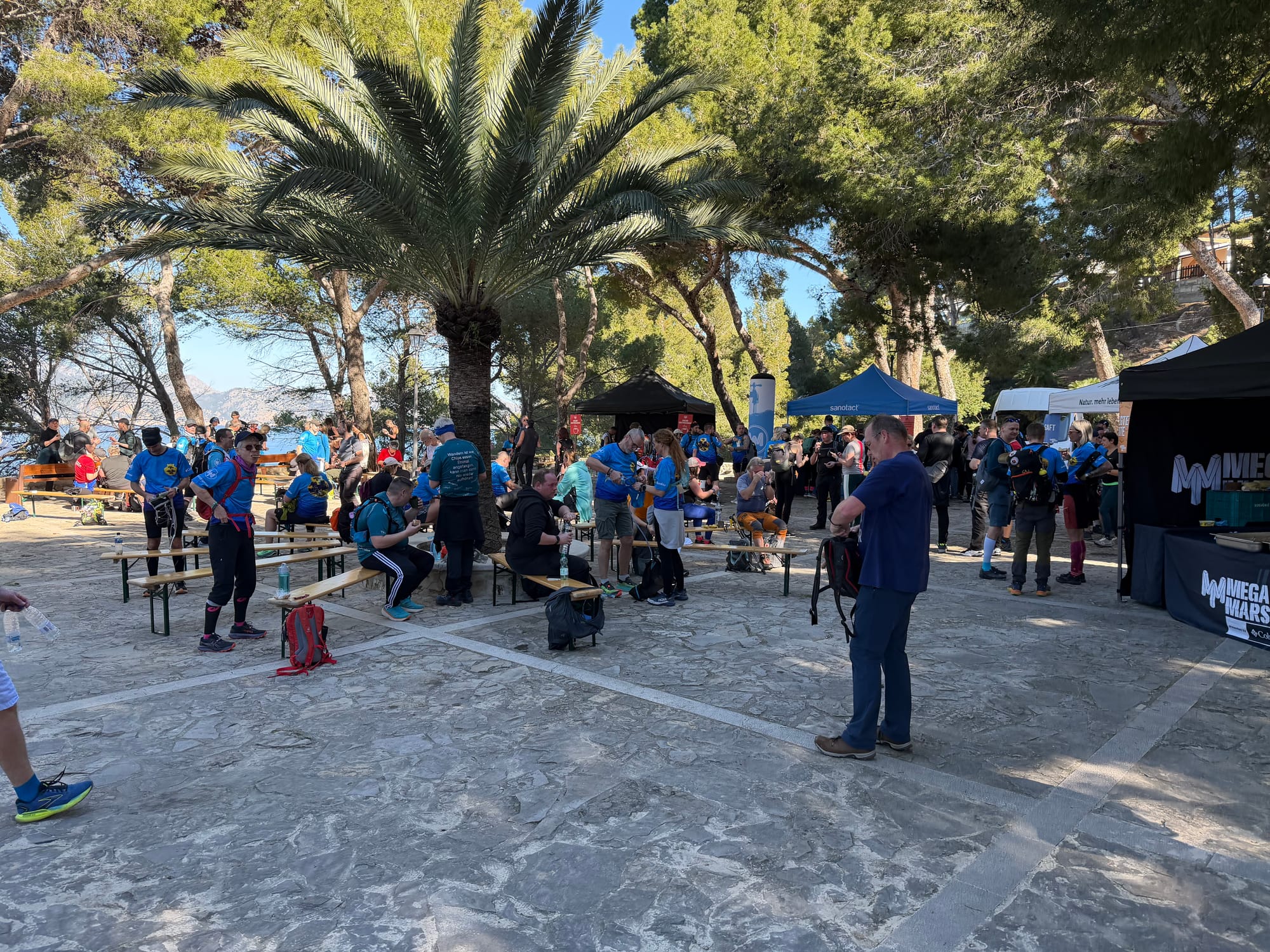 Beim Anstieg zur Ermita de la Victoria bin ich ganz schön ins Schwitzen gekommen … 1.3 km mit Anstieg bis 8.8%. Oben gab es den Verpflegungsposten 2 mit den Obst, Snacks, Gebäck, Gurken, Kaffee und Cola. Ich habe viele andere Teilnehmer gesehen, die eine ganze Dose Ravioli mitgenommen und kalt gegessen haben. Ist das etwa der Geheimtipp ?